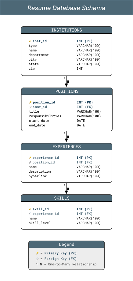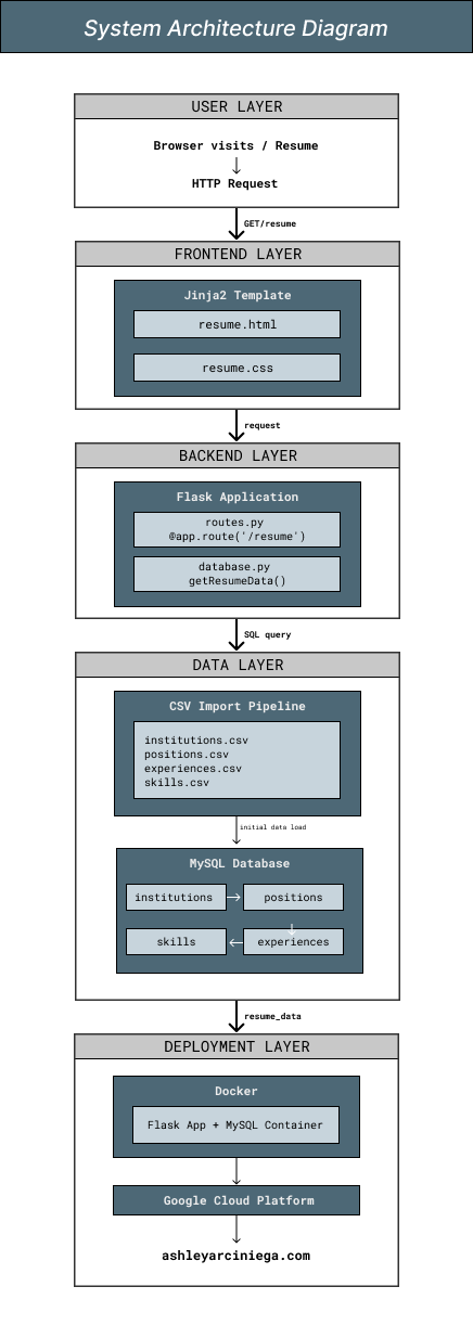 Designed and implemented dynamic resume page that renders content from normalized MySQL database. Created relational schema across four tables with automated CSV import system and custom Python data models that build nested dictionary structures for template rendering.